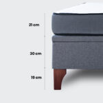 Finalmente, el diseño se completa con patas de madera maciza de 19 cm de altura. Estas patas no solo añaden un toque de calidez y solidez al conjunto, sino que también elevan la base a una altura cómoda, facilitando la limpieza del suelo debajo de la cama y permitiendo el paso de robots aspiradores para un mantenimiento sin complicaciones.